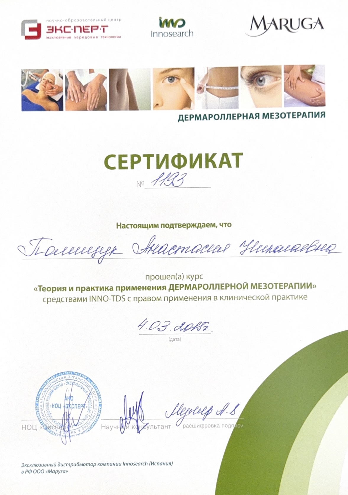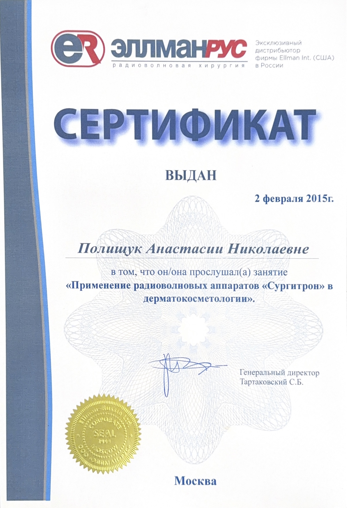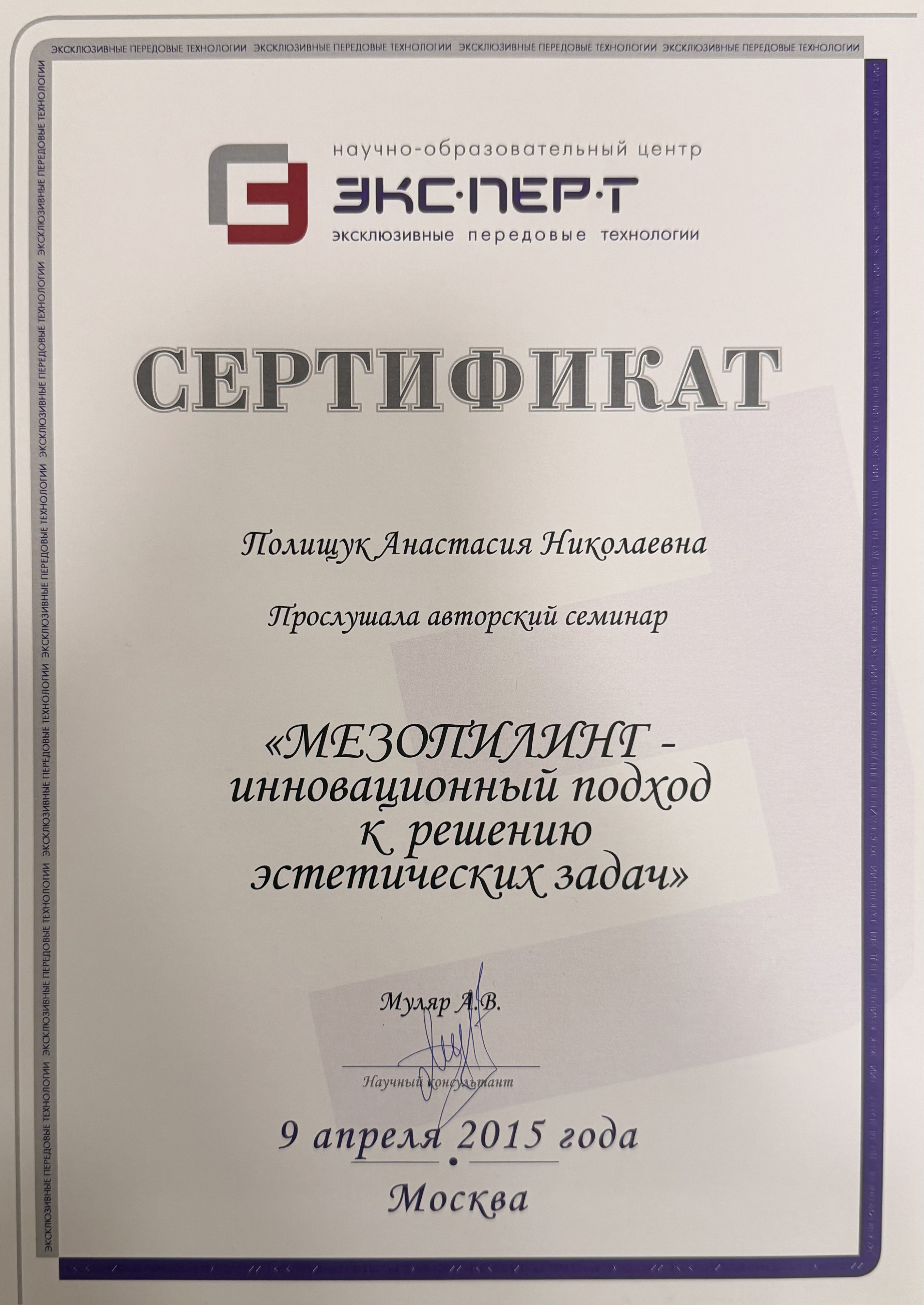 2015г. обучение применению радиоволновых аппаратов «Сургитрон» в дерматокосметологии»; «Лазерная биоревитализация с использованием косметики «Гельтек»; «Теория и практика применения Дермароллерной мезотерапии»; Мезопилинг»; применение системы «ZO SkinHealth, ZO Medical»; обучение по хемоэксфолиантам линейки «Еnerpeel»; обучение в компании Маруга «По использованию препаратов VISCODERM 0,8% ; 1,6% ; 2%, VISCODERM Skinko и Skinko E»; курс «Теория и практика применения дермароллерной мезотерапии» средствами INNO-TDS c правом применения в клинической практике; сертификат на применение препарата «Белотеро» и «Glytone» компании «Мерц Фарма»; сертификат «JALUPRO – биоревитализация нового поколения», компания «Валлекс М».