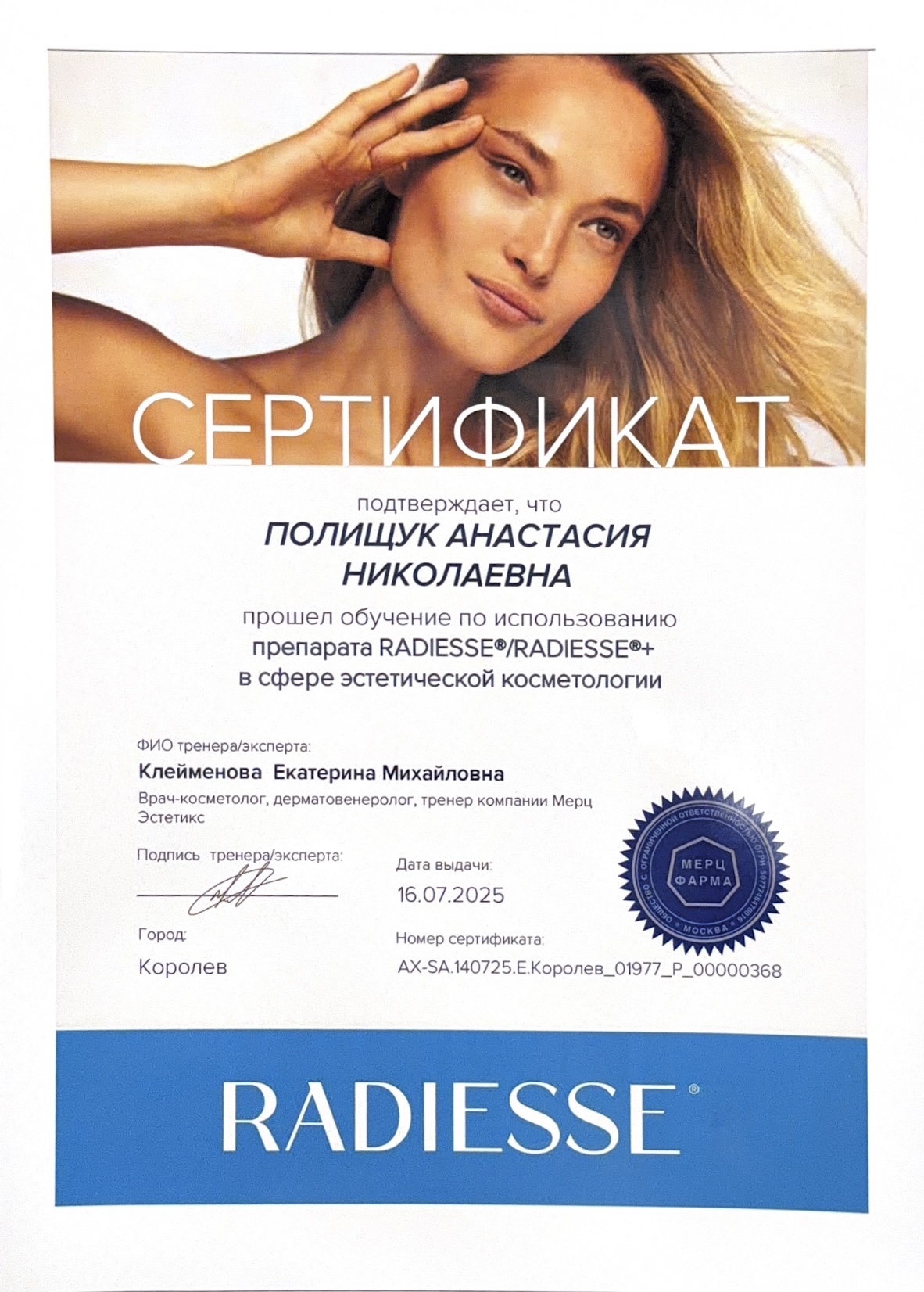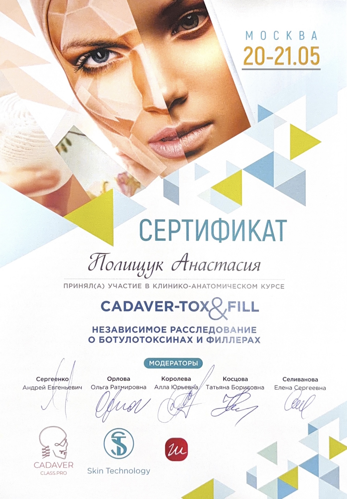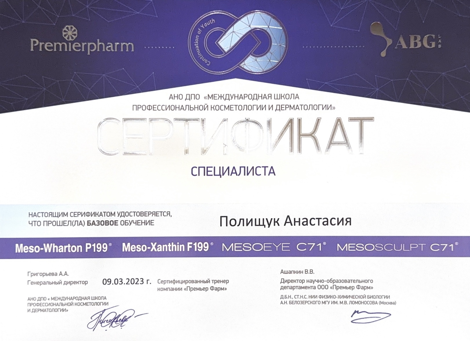 2015г. обучение применению радиоволновых аппаратов «Сургитрон» в дерматокосметологии»; «Лазерная биоревитализация с использованием косметики «Гельтек»; «Теория и практика применения Дермароллерной мезотерапии»; Мезопилинг»; применение системы «ZO SkinHealth, ZO Medical»; обучение по хемоэксфолиантам линейки «Еnerpeel»; обучение в компании Маруга «По использованию препаратов VISCODERM 0,8% ; 1,6% ; 2%, VISCODERM Skinko и Skinko E»; курс «Теория и практика применения дермароллерной мезотерапии» средствами INNO-TDS c правом применения в клинической практике; сертификат на применение препарата «Белотеро» и «Glytone» компании «Мерц Фарма»; сертификат «JALUPRO – биоревитализация нового поколения», компания «Валлекс М».