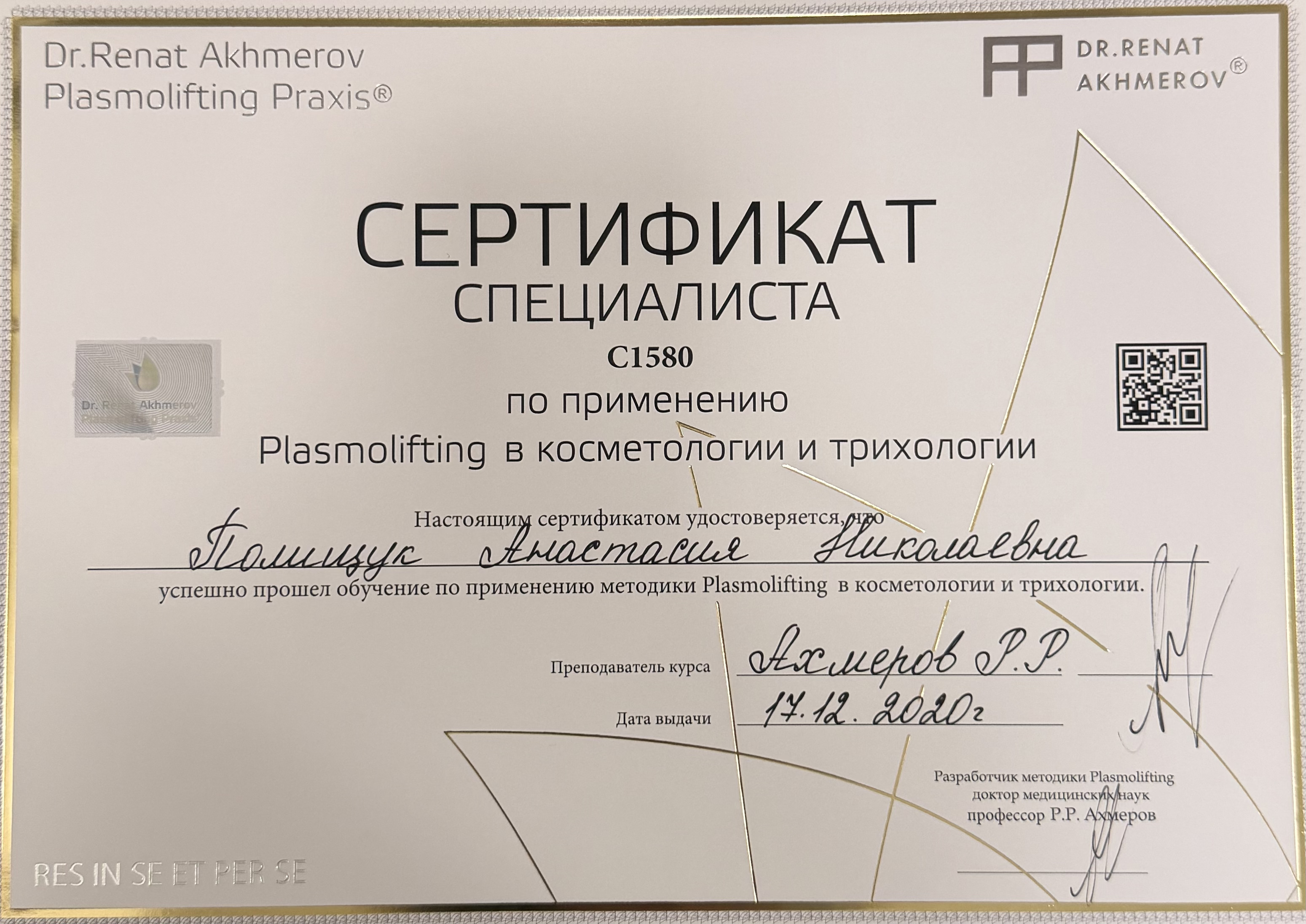 2020г. обучение по применению методики Plasmolifting в косметологии и трихологии у преподавателя курса и разработчика методики ДМН профессора Р.Р.Ахмерова.
