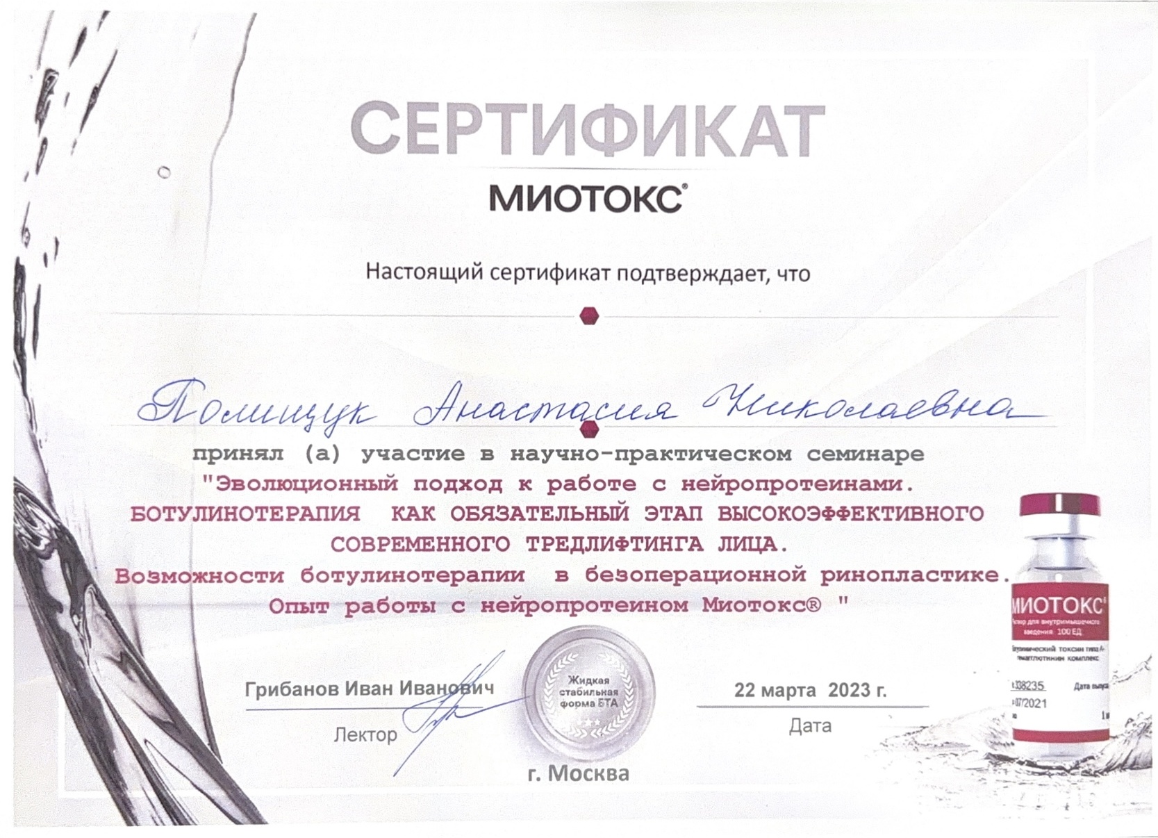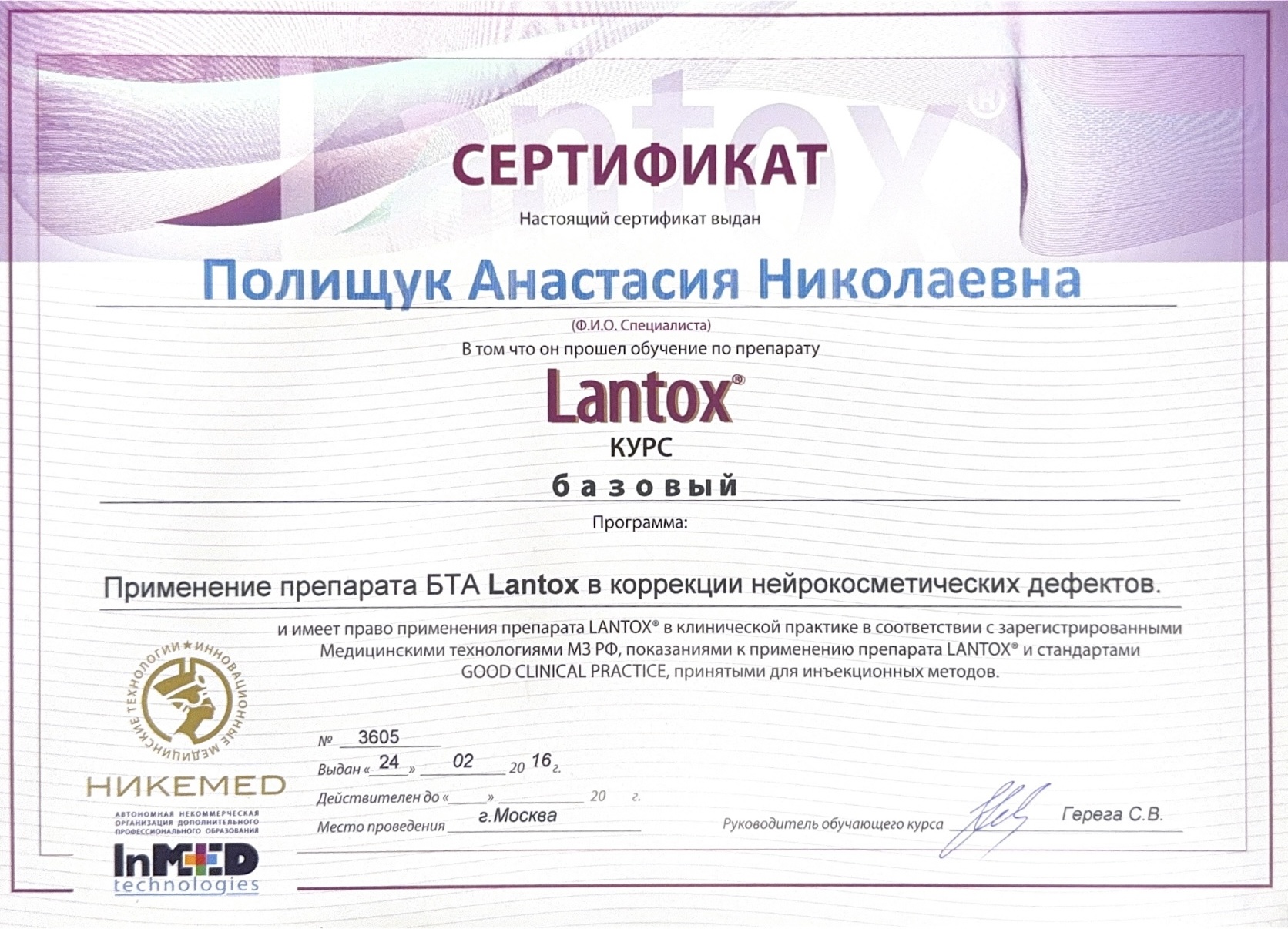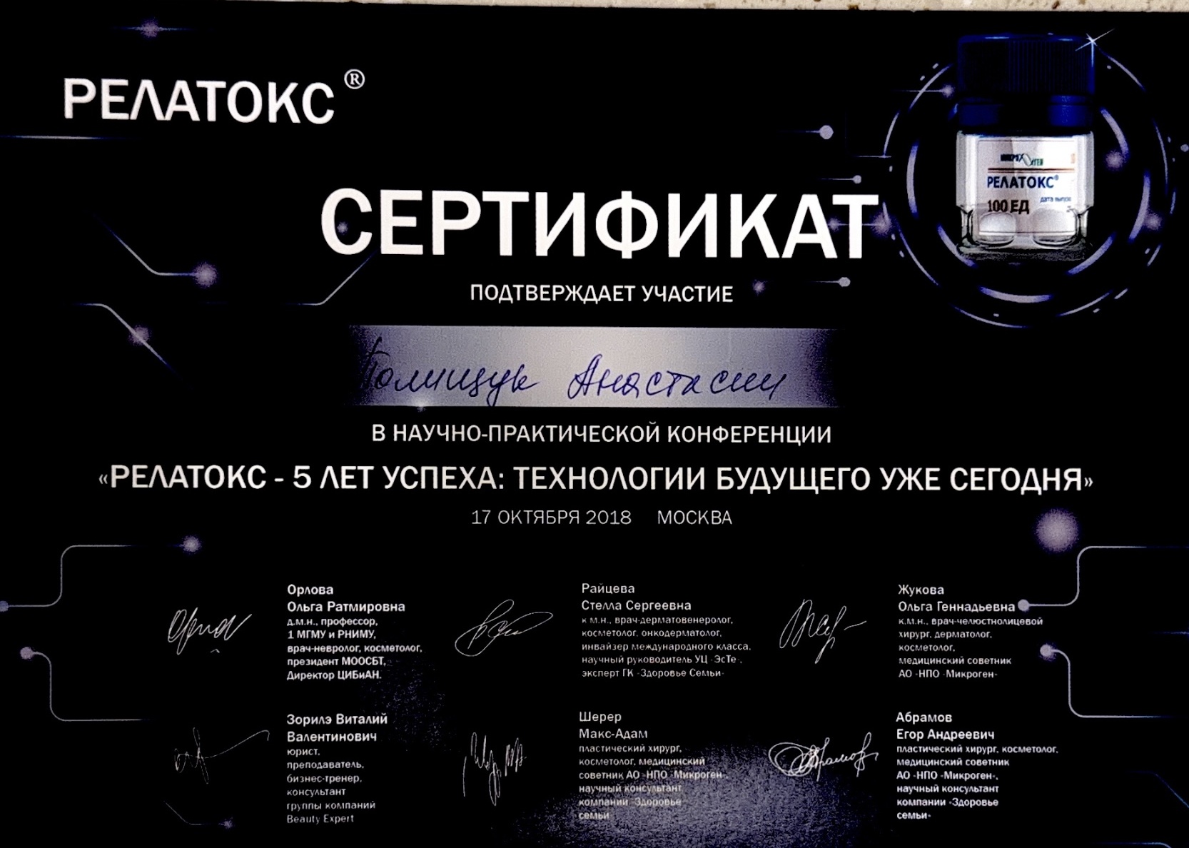 2016г. Факультет повышения квалификации медицинских работников Медицинского института РУДН – повышение квалификации по программе «Применение препаратов токсина ботулизма в косметологии и эстетической медицине» препараты Релатокс, Диспорт, Ботокс, Lantox и Ксеомин.
