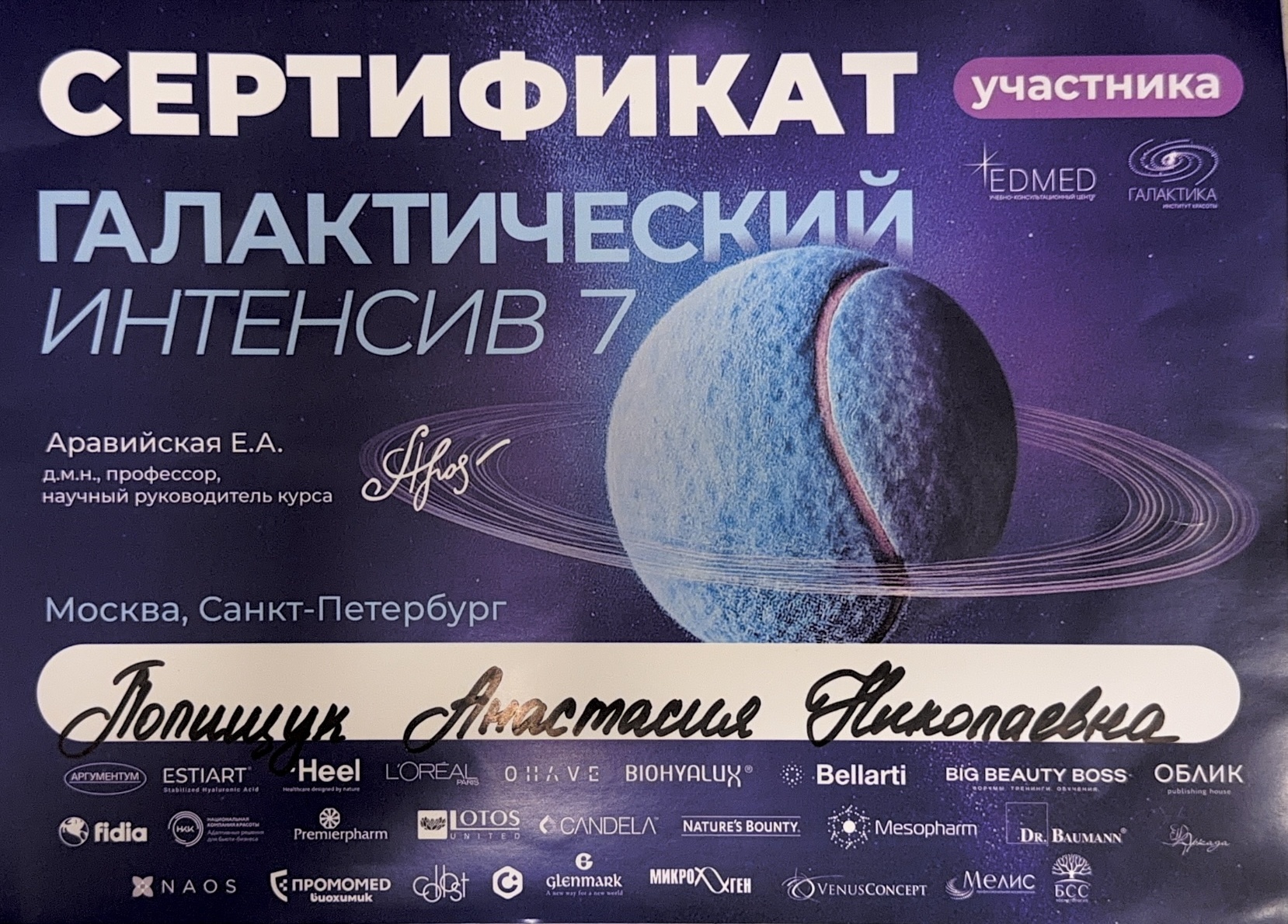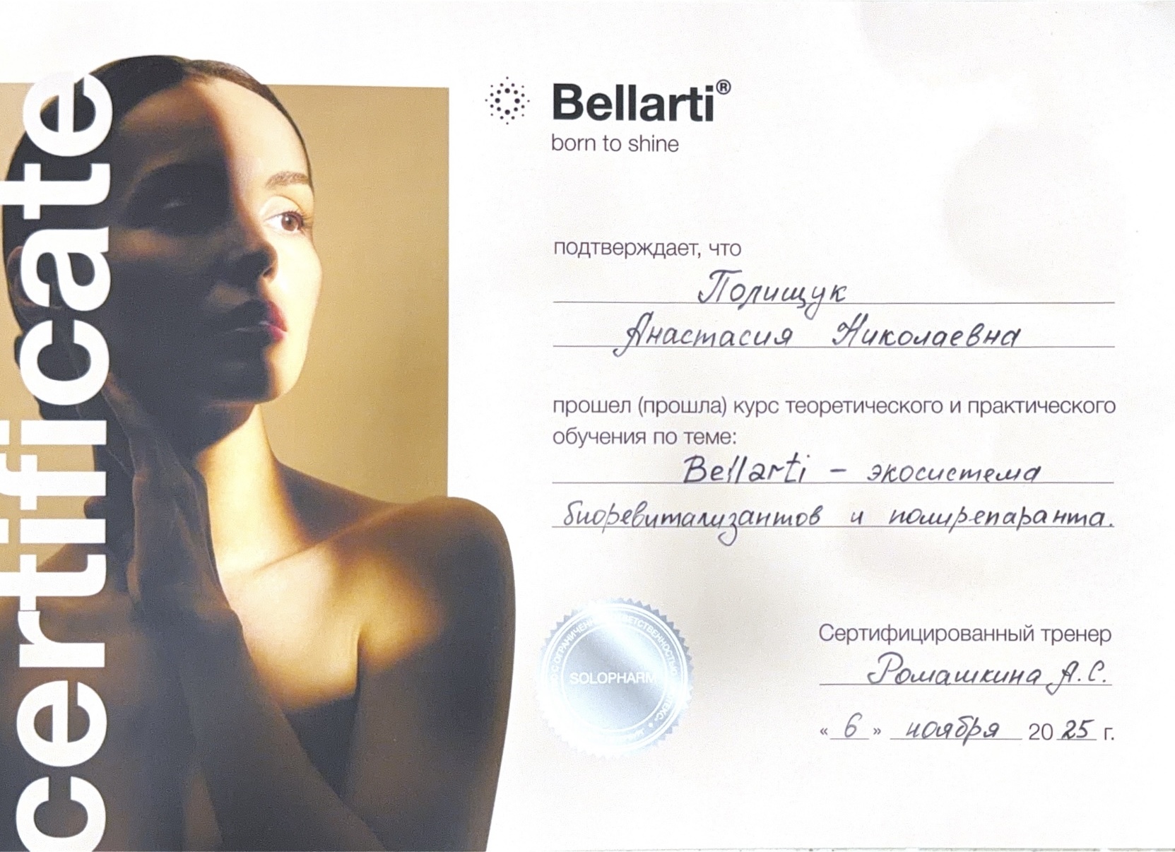 2024г. прошла курс теоретического и практического обучения по теме: Bellarti биоревитализация".